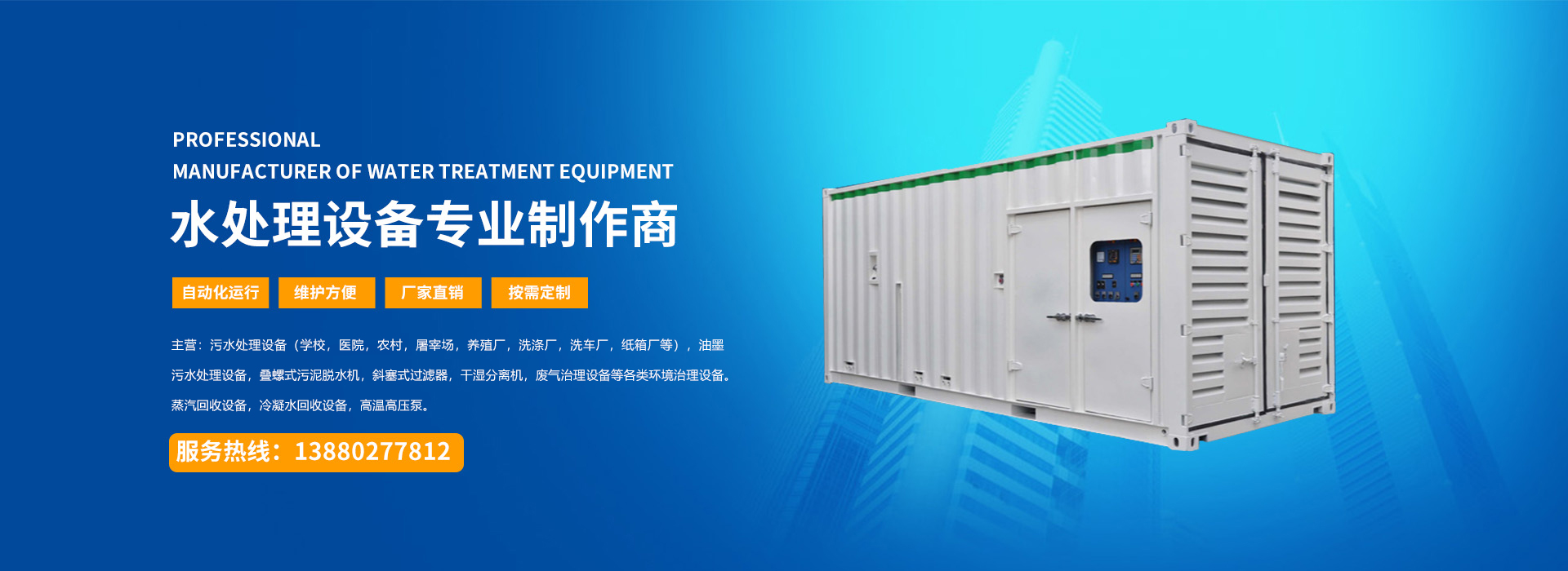 四川宇藍環保工程有限公司是水處理設備及各類環境治理設備的生產廠家并承接各類環境治理設備的工程項目。 公司專門從事各類環境治理設備及冷凝水蒸汽回收設備的開發、設計、制造、銷售以及技術服務的綜合性公司,主要產品有:污水處理設備(學校,農村,屠宰場,養殖場,醫院,小區,紙箱廠,洗滌廠等),油墨污水處理設備,疊螺式污泥脫水機,斜塞式過濾器,干濕分離機,廢氣治理設備等各類環境治理設備以及蒸汽回收設備,冷凝水回收設備,高溫高壓泵等各類節能減排的節能設備。 ...